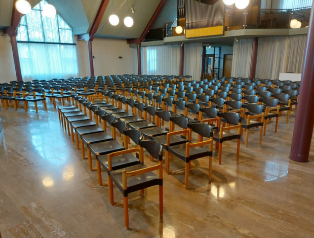 Degelijke houten kerkstoelen. Stapelbaar tot ongeveer 5 stuks.